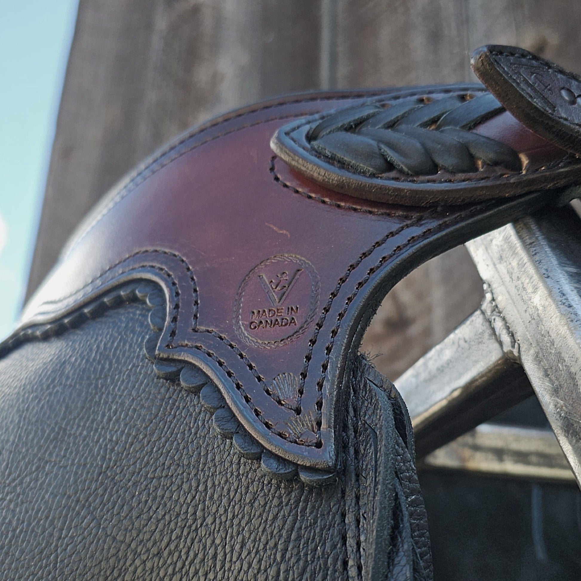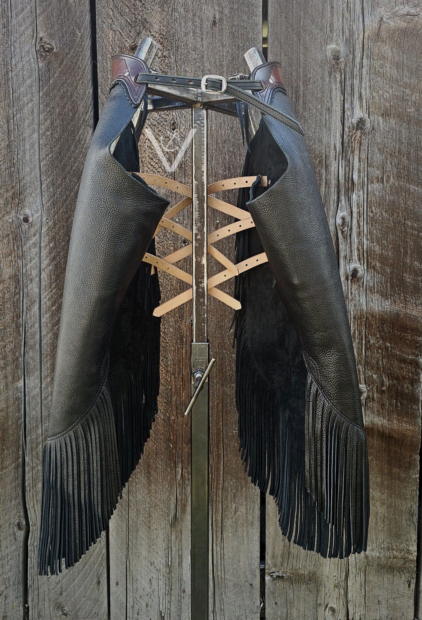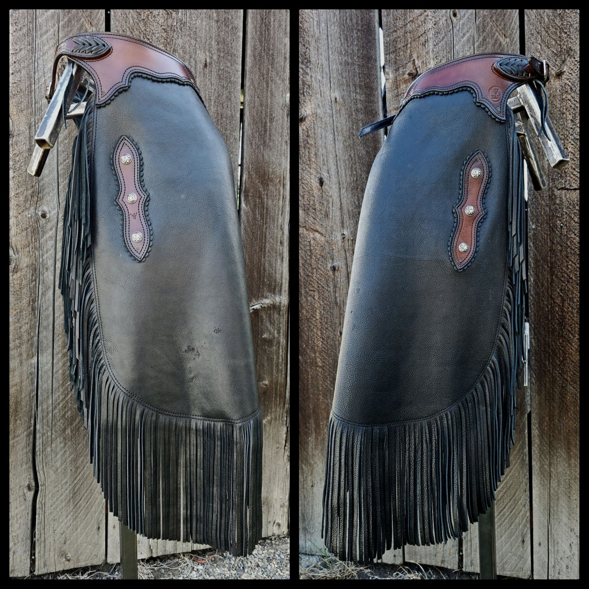 The custom-dyed yokes are complemented by a sharp, contrasting Black bison scalloped underlay for a high-end look. Finished with Steel Al Stohlman buckles and a double-stitched hem, these chinks are: Tough enough for ranch work, Classy enough for the show ring, Comfortable enough for any trail ride.