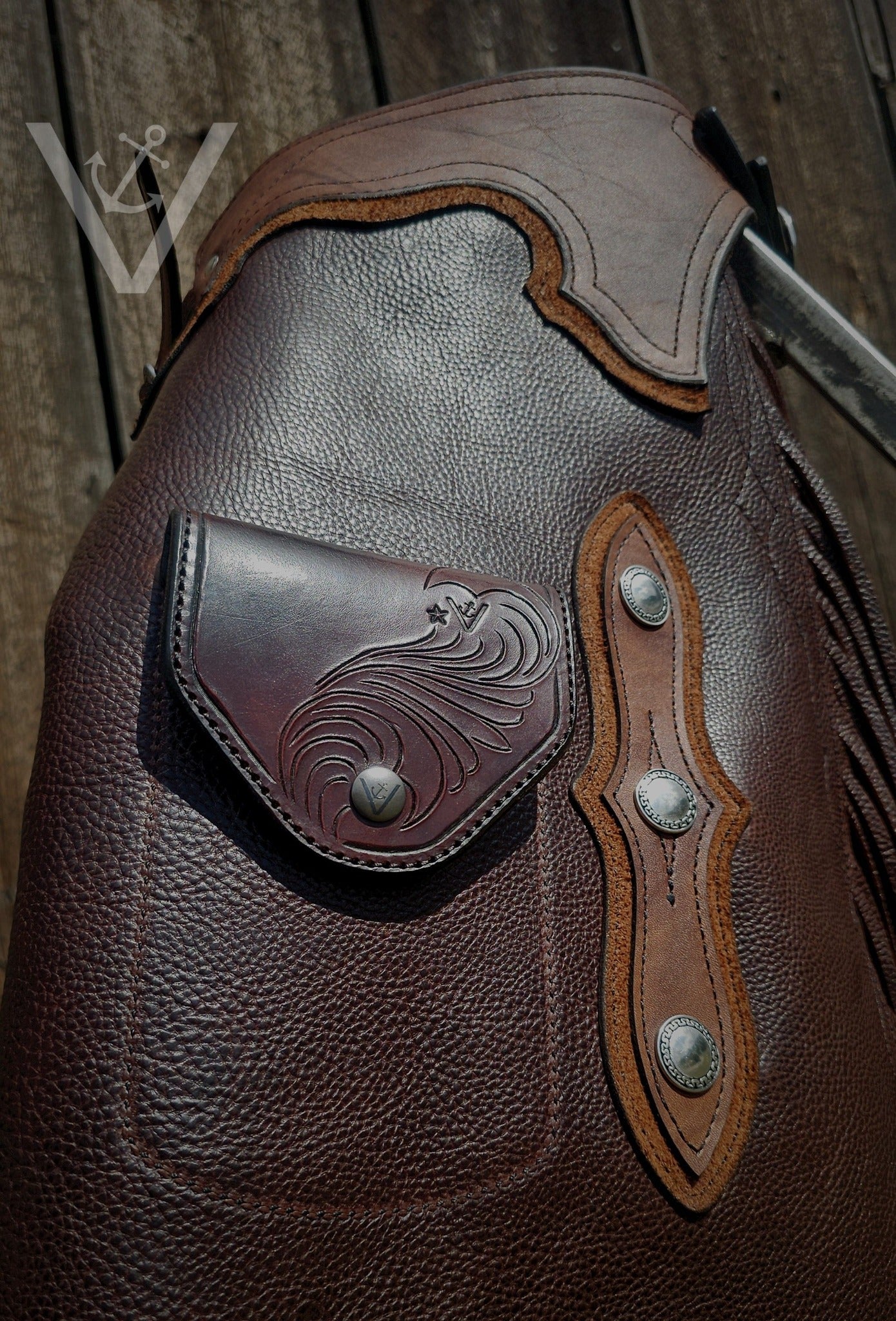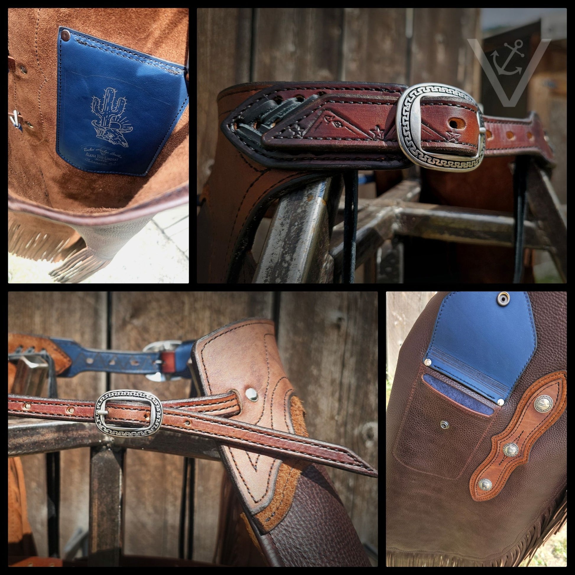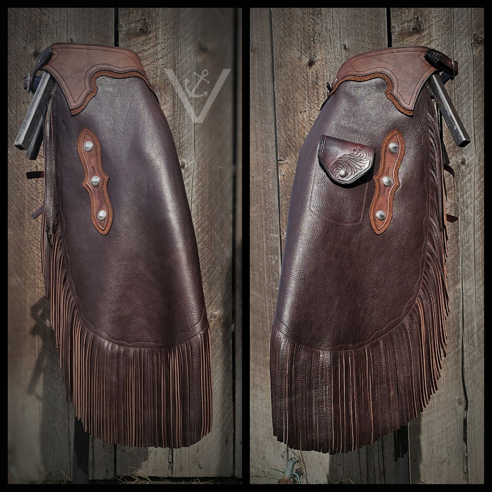 Leather: Medium weight dark brown chap leather with blue lining built for the long haul.